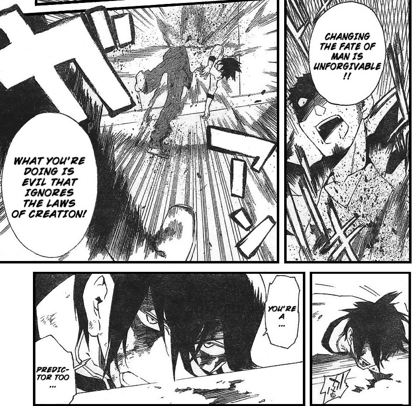 This guy Banjou has a notebook filled with fuzzy photographs. They all give clues about someone’s death in the relatively near future, whether it be from be crushed by falling debris or being caught in a terrorist bombing. He has devoted himself to giving 100% of his effort to preventing each and every one of those deaths, no matter the cost. And he doesn’t have to worry about getting himself killed while doing it, either – you see, the last prediction in the book is of his own death. In his mind, preventing all of the deaths he has perceived with his clairvoyance means that his untimely death can also be prevented, and missing just one would invalidate that concept.