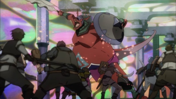 If you hadn’t gotten the point that Sword Art Online is indeed a video game, then this episode really hammers it home. There are numerous shots of characters opening up their inventory to eat food items or use health potions, and the boss dungeon is a typical raid with multiple parties. Kirito partners up with Asuna (the obvious main heroine, if her presence in the OP didn’t tip you off), befriending her by explaining game mechanics and sharing his food items.