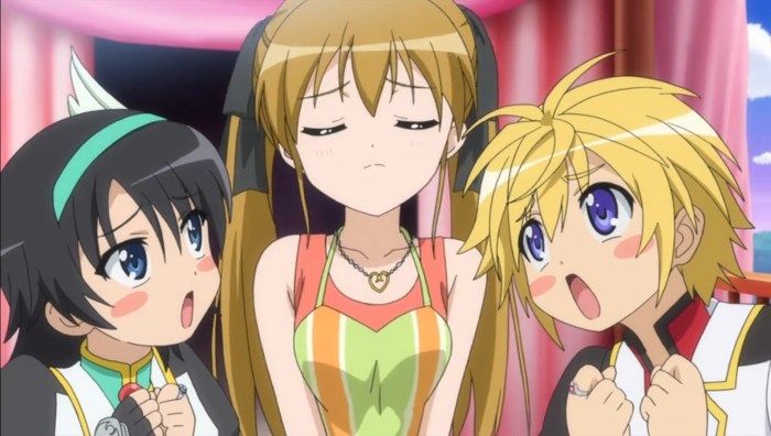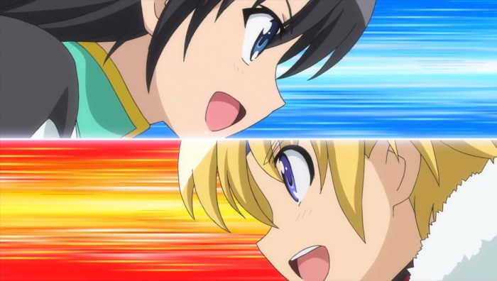 If there is one thing Dog Days has consistently nailed thus far, It is expressing how much these characters enjoy competing in and watching these organised wars. Everything about them is flashy as hell and way over the top. It doesn’t take long before the two heroes finally meet up and partake in a “conversation” that escalates to them firing magical beams at each other. After the dust settles and one rather unfriendly artillery strike later our heroes find themselves, much to Cinque’s dismay of seeing his cousin stripped down to her cat-themed undergarments, minus some battle armor. While this is going on the heroes’ escorts, Galette’s Princess Leo and Biscotti’s Eclair and Yukikaze also duke it out with similar results. It is nice to see them step away from the outright nudity a little bit as it would have been just as easy for those two to end up naked. At this point the joke is already becoming slightly overplayed seeing as it was just in the last episode.