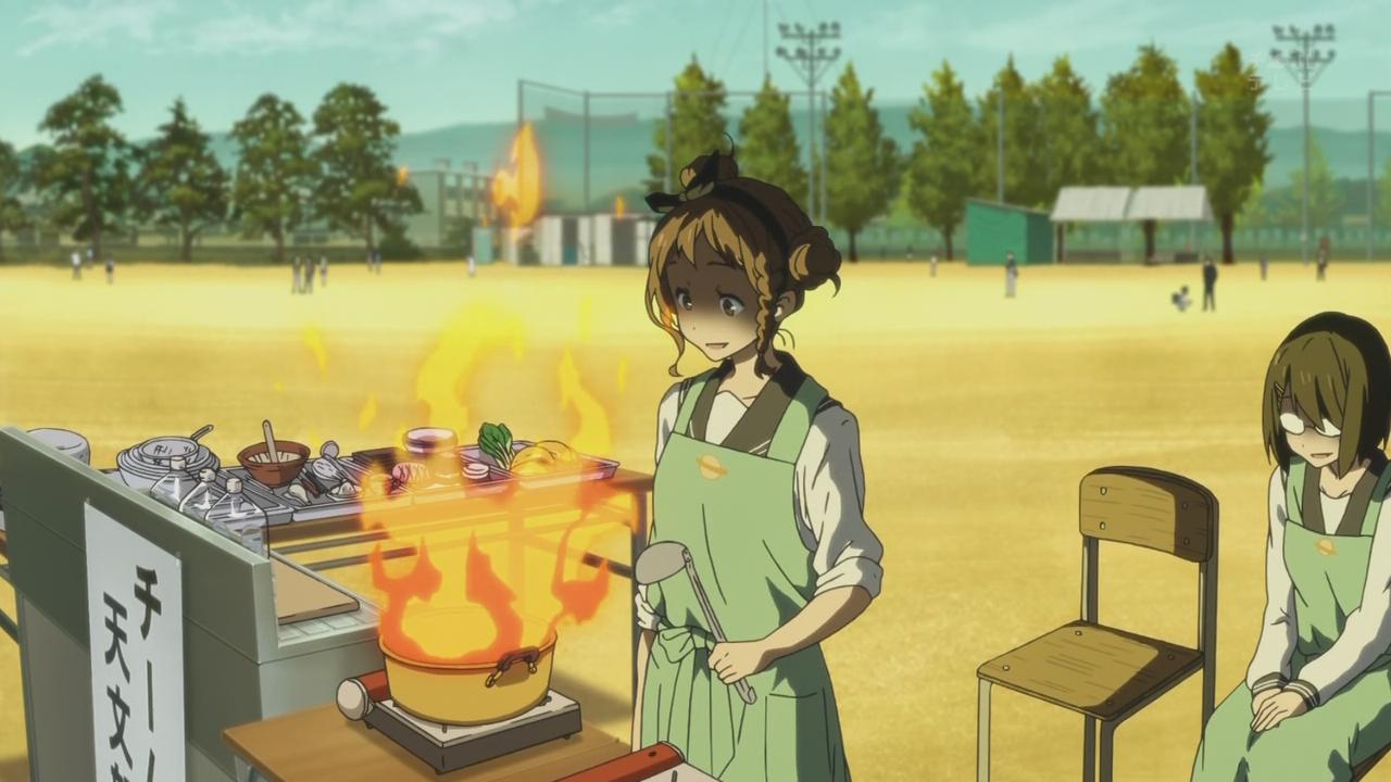 The cooking contest proceeds, with Mayaka set to go last to give her time to arrive. Chitanda whips out her hidden cooking skills and creates several fabulous dishes, but unwittingly uses up nearly all the ingredients – when Mayaka finally arrives almost ten minutes late to her segment, she has only shrimp heads and some vegetables. Houtarou is able to get their attention from the club window and tosses Satoshi a bag of flour he got from the Sweets Club, completing the trading quest. Despite a problem with missing cooking utensils, Mayaka manages to uses this final ingredient to make a tempura dish at the last second, and nets the Classics Club the win.