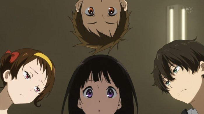 Meanwhile, Houtarou has a short chat with Mayaka in the clubroom and practically admits straight out that he can’t stop himself from getting involved when Chitanda makes her eyes at him. Before she leaves, he asks her for something in return for the flour he gave them last episode, and gets a hand mirror in return. He can’t abandon the trading quest until he gets the Biggoron Sword, after all. She returns to the Manga Society, and after being laughed at by the vocaloid bitches, Mayaka gets a pep talk about FRIENDSHIP from the club’s president and finds out that the vice-president is somehow related to the “A Corpse by Evening” manga mentioned previously.