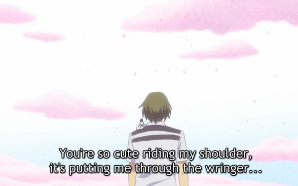 I was actually quite disappointed by this episode. I was really hoping for more to happen. While I can understand Ryuusuke entering the dream world needs time to develop, it just drops a whole bunch of questions and only answers maybe one. I also felt much more needed to happen, something to signify this place is special. In the end the conversation between him and the fairy Rokka amounted to that of an NPC telling you to go find the prince without any explanation.
