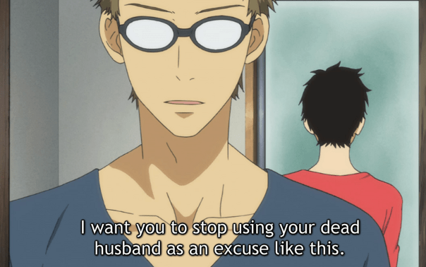 It was nice to see more come out of the picturebook world this week. Since it seemed to originate from Atushi’s conscience, I was thinking it would be giving Ryousuke a glimpse into their married life. Instead, it seems to be making Ryousuke look inward, this week figuring out why he ever started loving Rokka in the first place. It was somewhat funny to hear his first description of her, as even with her long lashes she doesn’t look very feminine. It was sweet to hear him talk about positively her because of natures of her character, rather than any carnal attraction. It makes Ryousuke’s love seem more real to me, that it’s the sum parts of Rokka that made him fall in love with her first.