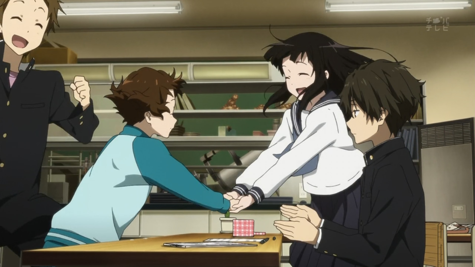 Satoshi harbors similar feelings of inadequacy towards Houtarou, but manages to sneak in his revenge. As the club members each buy one of the last four copies of Hyouka, Satoshi tips off Chitanda that Houtarou knows how the whole incident resolves, cuing her sparkly eyes yet again – and so the curious adventures of the Classics Club continue.