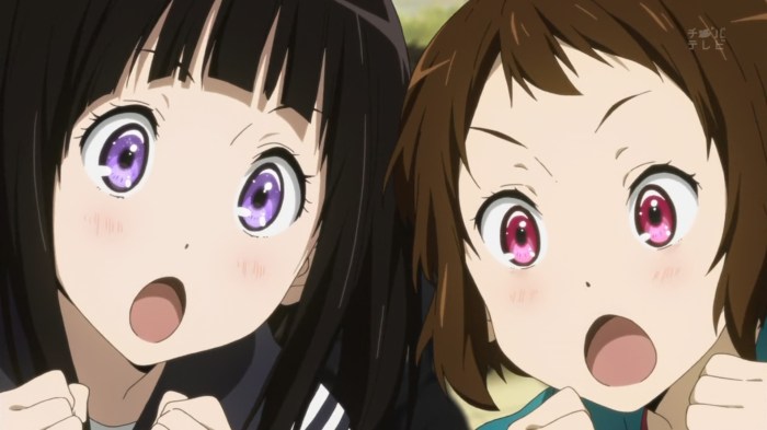 Iro’s Thoughts: We start things off this episode with Chitanda on the Brodcast Club’s radio show – she flat out explains the Classics Club’s plans and asks everyone to drop by and buy some anthologies. With a good two dozen people hanging around in the clubroom, surrounding the item Juumoji intends to take, there’s no way he can manage it, right?