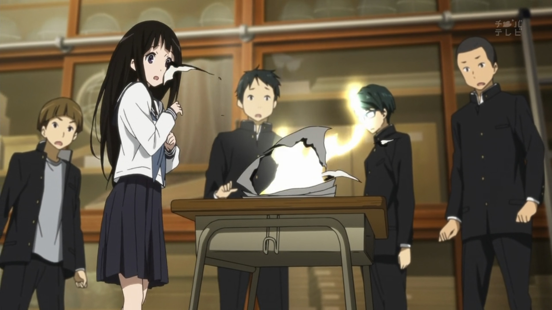 Houtarou blackmails Tanabe with the knowledge that he was the true culprit, getting him to buy 30 copies of Hyouka to sell on the school’s website. In return, he helps set up the theatrical explosion inside the crowded clubroom, giving off the appearance that Juumoji has beaten them all and completed the perfect crime. But with this the Classics Club has sold nearly every copy of their anthology, and to Houtarou’s eyes this may as well be considered a victory.