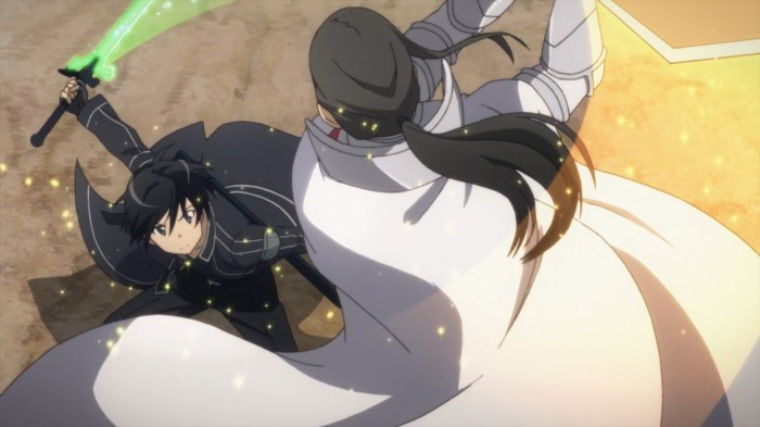 They meet up the next morning for the day’s dungeon run in typical anime fashion: Asuna falls on top of him, and he gets a few good gropes in before she slaps him across the plaza. But Kuradeel, her guild escort and all around creepy bastard, has followed her – his orders are to protect her at all times, after all, and any truly noble escort would obviously interpret that to also mean stalking her home and eavesdropping on her private conversations. Kirito stands up for his not-girlfriend and gets dragged into a one-on-one duel with Kuradeel, but our offensively perfect hero makes short work of him. Since Kuradeel has opted for more decor than function when it comes to his weaponry, Kirito is able to shatter it with a single blow and claim victory. Kuradeel tries for a sneak attack, but Asuna steps in and dismisses him as her escort, leaving the bastard broken and humiliated.