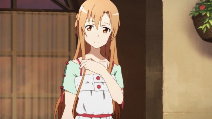 While heading back to town after some time mapping the 74th floor’s dungeon, Kirito kills an elusive monster and manages to clinch some Ragout Rabbit, the rarest food item in the entire game. His first instinct is to sell it at Agil’s shop and make some mad bank, but Asuna shows up with her guild escort to say hello. Since of course the prettiest female player in the game has mastered the Cooking skill in lieu of skills that will actually keep her alive while out on the front lines, Kirito talks her into cooking it for him. Asuna leads Kirito back to her own house, where they eat a virtual meal together and muse on their life in Sword Art Online – after nearly two years living in the game, the real world seems like a distant dream.