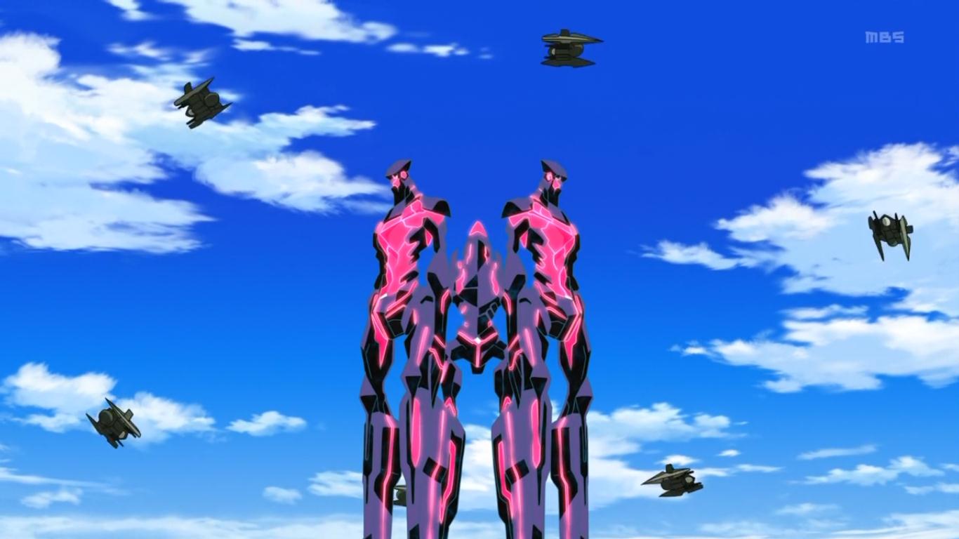 Dragonzigg’s Thoughts: This week’s episode is very much a show of two halves. The first half is a dull, uninteresting slog, mired in the same boring politics that have constantly extinguished any threat of Ao reaching for the heavens. There’s little redeeming value to be found in any of these sequences, although the sight of the Secrets emerging to halt the Allied battleships is a striking one. The nadir of this sequence is probably Naru’s completely baffling re-entry into the story. I must admit, there’s a certain surreal charm to seeing her in her ridiculous rabbit getup just eating at the table, but it swiftly gives way to confusion at the sheer insanity of the situation. Naru had been built up as this mystical, powerful figure with an almost magical connection to the coral. So seeing her reduced to leading a bunch of protestors is horribly damaging to whatever credibility the character possessed. It also makes absolutely no sense in universe. The military have seen that she possesses supernatural powers and she stole a giant robot – why is she still allowed to walk free? I joked last week about her simply being forgotten about, but unless she can be tied back into the main plot fast it looks that that might actually be her fate.