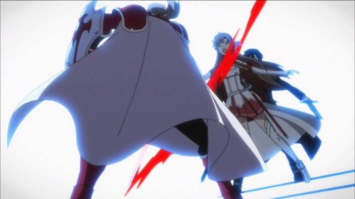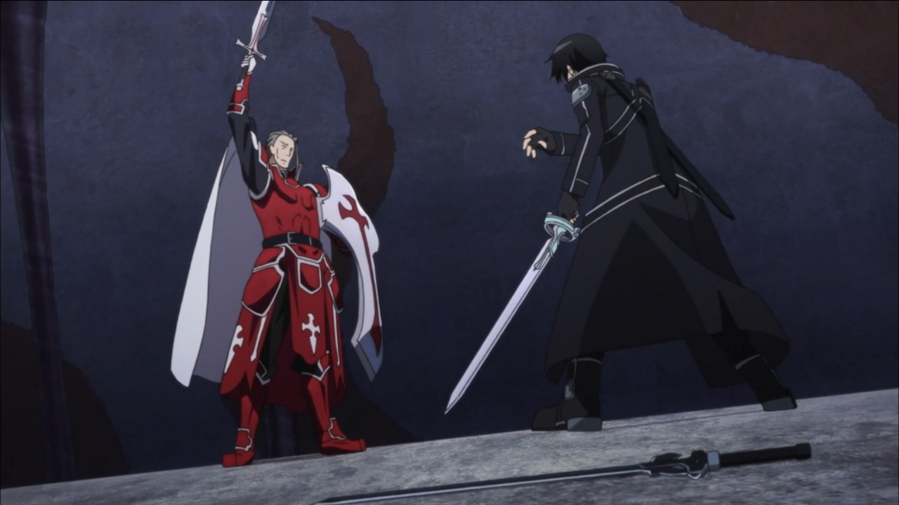 Heathcliff and Kirito duel, a sequence that consists mainly of stock footage of Kirito’s fight against The Gleameyes in episode 9. Heathcliff wins handily, but the dreaded Deus Ex Machina strikes multiple times in a row as:
