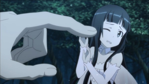 At any rate, Kirito logs into the new game, and somehow gets to keep all of his maxed skills from SAO. Somehow all of his items are corrupted except for the gem that he magically turned Yui into in episode 12, so he revives her (somehow) into a pixie, making here even more annoying. Also, he somehow logs into a random place in the gameworld instead of his race’s starting town. Notice how I’m using “somehow” a lot, because the reason for all of these things is “shut up, because plot!”