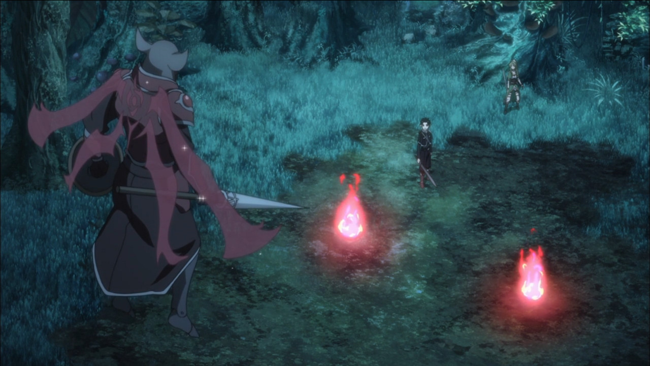 This is a solid episode, and a much better one than the last one because it concentrates on the greatest strength SAO possesses, namely the detail and texture of the world the story is set in. Granted, there’s probably a little too much sit-down-and-spew exposition but it’s mostly interesting stuff that does a good job in distinguishing the differences between SAO and ALO. It’s helped along by some lovely art and animation in the first half of this episode. I’m a big fan of the slightly more organic design of ALO as opposed to the traditional high fantasy of SAO and A1 do a very nice job of sketching out the leafy vales and floating islands (and the big, BIG moon!) that give the world it’s unique flavour. I’m also a big fan of the unique design of the city of Sylvian, which was very striking. Though it may seem like a small addition, the flying really does open up the movement of the characters a lot more and that combined with the removal of the omnipresent permadeath threat makes this feel like a lighter, slightly more whimsical version of the premise, though there is definitely a potential loss of drama associated with that.