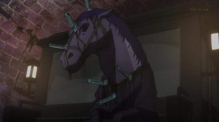 What I wasn’t prepared for was such a rapid return to the main plot. I’d totally anticipated Dio lying low for a few episodes but instead he’s right back, looking more and more like a Super Saiyan porn star than ever, and creating vampire Jack the Ripper, as you do. The delightful silliness that has made JoJo so much fun to watch so far reaches all new heights here. I completely lost it at Zepelli’s wine-buzzsaw attack, particularly as he actually says ‘pew pew pew’ as he launches them and as ever the contrast between the hyper-masculine dialogue and the reality of what is actually happening on screen (hiding yourself inside a horse for example) is so much fun it makes up for the slightly wobbly structure of this episode. I do wish we’d get a bit more of a chance to develop the JoJo/Erina relationship, which is less than a footnote at this point, but I suppose if you had to cut something, that’s it. The show is also becoming slightly more recognisable as a traditional shonen fighting story (arch-enemy, training montage, crazy new power etc) but there’s still so much overflowing oddity that it remains a constantly surprising pleasure to watch.