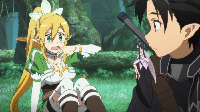 Not a lot happens this episode, since it’s mostly buildup to the actual plot. ALO apparently has very strange mechanics for its races, if just straying outside of your home race’s territory seemingly brands you as a renegade, making you free pickings for everyone else. At any rate, Leafa sees it fit to ditch her party to hang out with the guy she met just yesterday, but it’s all good since she was about as important to her party as Silica was to her’s. She takes Kirito shopping (and apparently while all his items got corrupted, his money (I thought he spent it all on the house on the 22nd floor?) merely transformed into new money, because plot), and they take off for Yggdrasil. Also, she’s a huge bitch to a guy who really doesn’t deserve it and gets a bunch of really creepy and fetishistic fanservice shots.