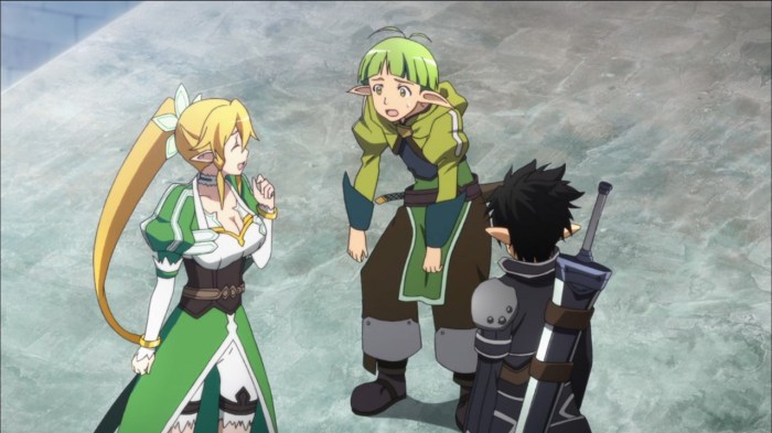 Suguha though does much better in-game as Leafa, as she has several decent scenes this episode. The high point has to be her spirited defiance against her asshole party leader, not backing down in the face of his threats and giving as good as she gets. It’s, not coincidentally I think, reminiscent of early Asuna and there’s a slight concern Leafa here is simply a replacement-by-proxy, though she deserves a little more time to try and establish her own character.