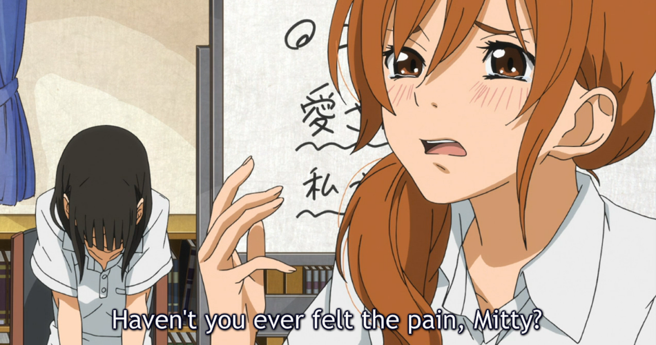 The poor girl gets nothing but grief once the group latches on to her, though. Asako and her omnipresent whiteboard make another hammy appearance in an attempt to “find her friends”, something I’ve really grown to love with her character. In the end, she blows up at Haru for not understanding Shizuku. As Haru points out, the biggest thing you have to realize in life is that not everyone is perfect. You also can’t force things, as much as Asako would love to believe to the contrary. Unfortunately, the biggest piece of advice Haru gives to her really should have been told to Shizuku.