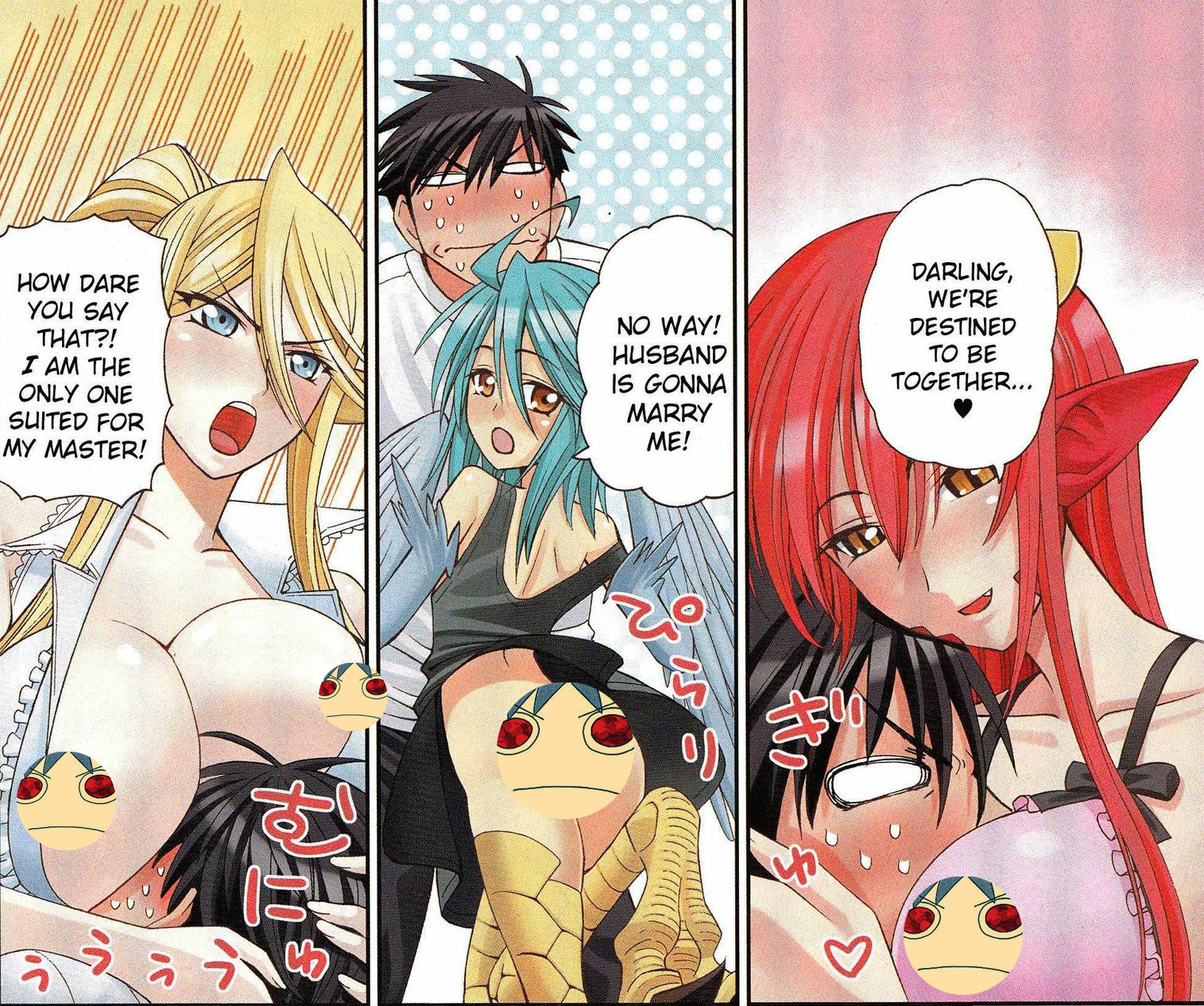 Not that this already contrived drama matters after the first few chapters, of course. Once the main harem trio of lamia, harpy, and centaur gets established, the government lets Kimihito know that he’s the first test subject for an interracial human-monster marriage, and that he has to choose one of the three ladies living with him. Cue harem antics upon yet more harem antics, with a side order of tits, boob groping for a beverage, and compromising poses for dessert.