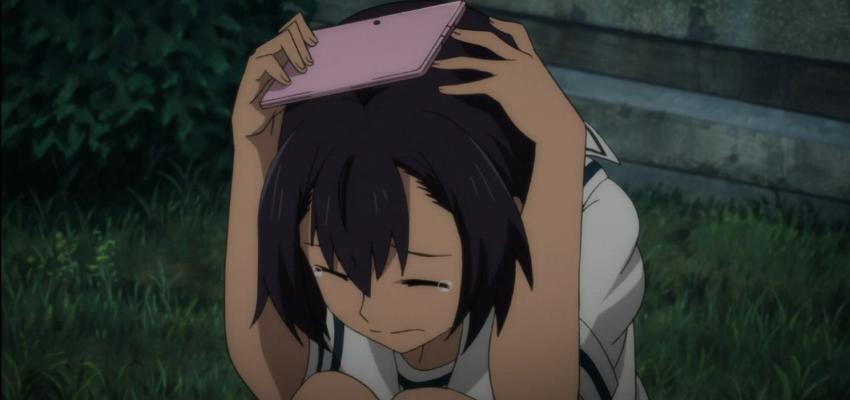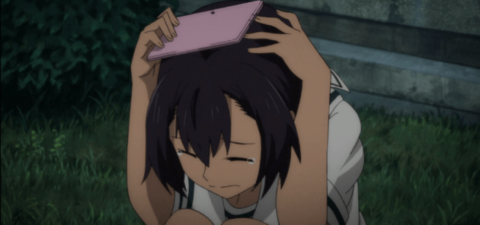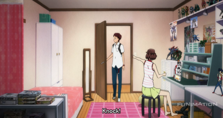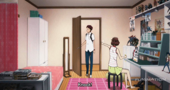 While the scenes between Junna and Kai were adorable, they really left me at a loss for our hero’s actions this week. First off, he goes and scares this girl he barely knows for no good reason. Idno if I’m just a softie, but the only times I’ve ever even tried to jokingly scare anyone it was with friends I’d known for years. Without the context of friendship it just makes Kai look like a jerk. You can also see his inner jerkness rise to the surface as he reads Aki’s tweet about her nervousness in being interviewed. Go back and look at that smile, my god that is a malicious smile if I’ve ever seen one. I’ll let him go for not wanting to do the interview since it’s obvious he’s just antisocial to begin with, but that smile just irked me somethin’ fierce. For our great hero’s last great moment of the episode, he barges into a girls room. Look, I get it, he and Aki are really close. Still, when someone comes to my place, they can enter the foyer without notice whenever they want, but if they want to see me in my room they knock the goddamn door I don’t care who they are.