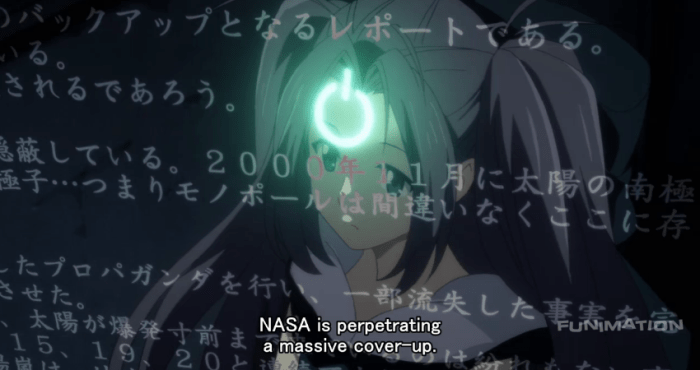 I really must take an aside to ask Nitro+ what they have against legitimate science. From the evil overlords in Steins;Gate’s CERN to the nefarious coverup from NASA, it seems to love taking the idea of likable agencies and giving them sinister motives. Honestly I can kind of understand why NASA would want to cover up the truth if the truth meant our sun is exploding. Something tells me that’s not a condition you can easily fix, and might as well not throw the world into inconsolable panic by telling them we’ve entered the friggin’