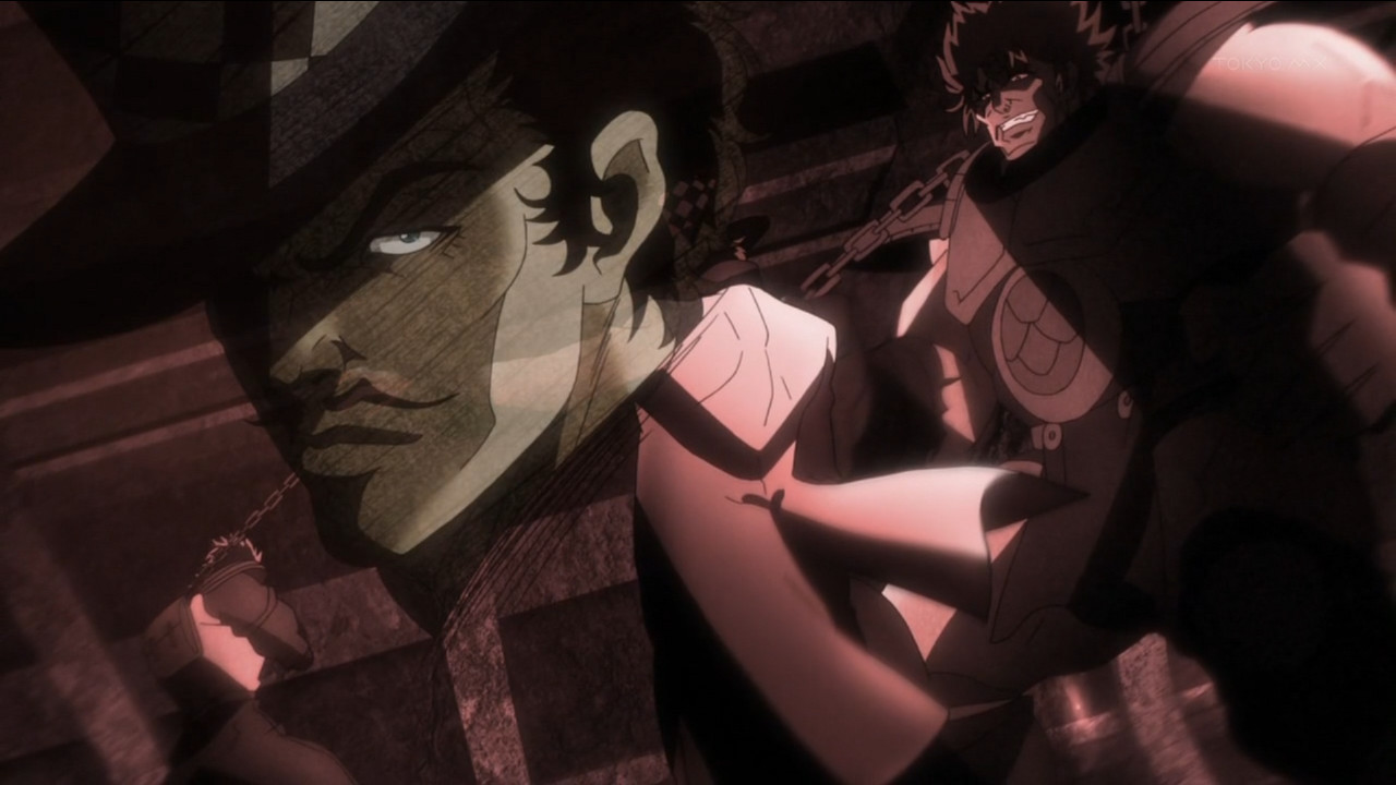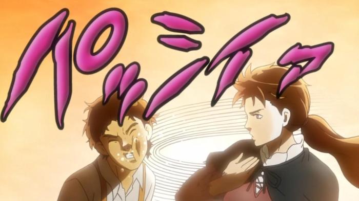 This is a slightly weird, off kilter episode of JoJo…well, more so than normal that is. Bruford’s ultra-melodramatic death scene veers wildly between stupid in the right and wrong ways; it feels totally undeserved for a character who’s appeared in the sum total of one episode (and been a magical hair vampire for most of that time) but then that’s assuming you’re meant to take it seriously. Taken as a comedy it’s pretty hilarious, and I must admit I completely lost it at the Luck -> PLuck scene which couldn’t be more randomly corny if it tried. Bonus points for the shot of JoJo and Bruford kneeling in a flowery field that might have been ripped straight from the pages of a shoujo manga.