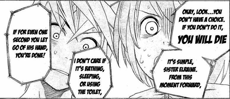 So, the couple ventures forth, with Kiri’s childhood friend, hot girl, and expert fighter Sui and World’s-Strongest-Man Fallan Denzel tagging along to keep them out of trouble. And from then onwards, it’s kind of a typical shonen, but it’s typical in the same way Magi is typical: it follows the story beats you might expect (The boy with the mysterious power is the only one who can save the world! They must get stronger and defeat their enemies!), but it does so in a fresh and fun way. The story’s interesting, and there’s a a good amount of worldbuilding and foreshadowing put into the background of the manga for plot events that never happen.