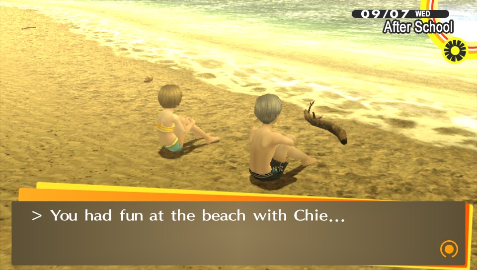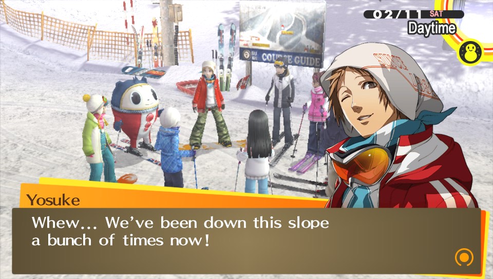 Of course, a fairly large portion of people interested in this game already know what’s up with Persona 4, having played it on the PS2. As it was with Persona 3 FES and Portable, this roll around it’s all about the new stuff. Pretty much all of the story beats in P4G are identical to the original game, but there’s plenty of new bits. This mostly means several more events with the rest of the Investigation Team, such as a trip to the ocean or a weekend spent at a ski resort. The larger timeskips of the original game (most notably, the months between Christmas and the actual ending) are filled in with more fun and socializing. Basically, if you feel like you’re buddies with the cast and wanted to spend more time hanging out and having fun with them, then you’ll probably get a kick out of this game.