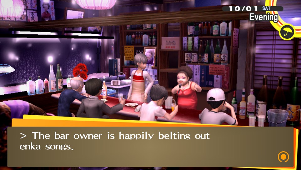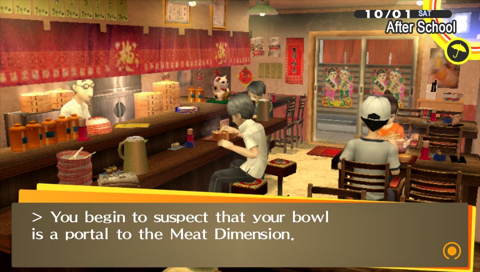 The gameplay in Persona 4 Golden is, as you might expect, largely the same as in Persona 4. You attend Yasogami High School during the day, receiving lectures from various teachers and making sure to study for exams. In your off time, you socialize with your friends or do various other activities, mostly to do sidequests or raise your attributes (Courage, Knowledge, Diligence, Understanding, and Expression) so that you can spend more time hanging out with your buddies. Or eat some Rainy Day Beef Bowl at Aiya. Everyone loves the Rainy Day Beef Bowl.
