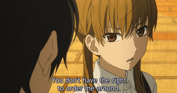 Haru is quite enigma himself. Shown to come from a troubled past and a broken family, it’s hard not to sympathize with him even as he acts out. Haru is as intelligent as he is belligerent, but because of the way he was raised he never got to connect with people. It’s this shared isolation that ironically brings him and Shizuku together, and what makes them so well matched. However, even with such understandable personality flaws it does not forgive him for becoming dependent and needy around Shizuku. He doesn’t seem to understand her and is afraid her want to focus on her own needs means she might drift away from him. His story is truly a tragic one, and unfortunately one that was not fully elaborated on by the end of the anime’s progression through the story.