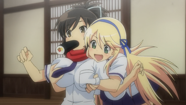 I have always appreciated and admired the blunt “people want it so we made it” attitude of the devs of the Senran Kagura games, and it seems the anime has that same attitude. It almost seems like the entire premise is meant to or at least comes across to me as a parody of the genre. “People like big boobs so we made everyone well endowed. People like seeing girls seductively eat things so we had them eat sushi rolls and randomly show them licking freeze pops. Breast groping? Yeah, we better have plenty of that since people like that sort of thing. Transformation scenes? Aww yea, gotta have those!” It feels like someone is going through a checklist and poking fun while they do. I just hope Senran can keep its material fresh because most of the jokes and visual gags, like the instructor entering and leaving in a cloud of smoke, or the secret laundryish chute to the practice arena, are pretty funny.