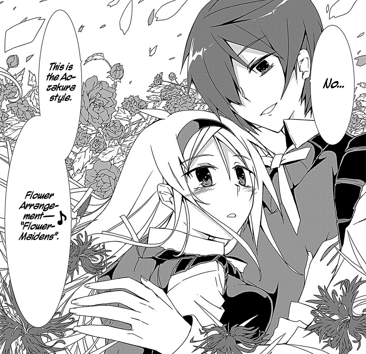Cut to present day, present time, where a really weird enthusiastic guy named Aozakura transfers into Mikoto’s school. He’s both super rich and obsessed with flowers, and wants to start a flower arranging club at the school. But not just any plain old regular flower arranging club: his is all about taking pictures of hot chicks lounging around with flowers. Since Mikoto is connected with flowers and has flower tattoos, she’s perfect to be his first subject (I guess he also has the same marks, but he can’t speak to flowers or something? Whatever). And thus begins a love harem comedy thing about their adventures to start up the new flower arrangement club, but with hot girls. Sure, why not.