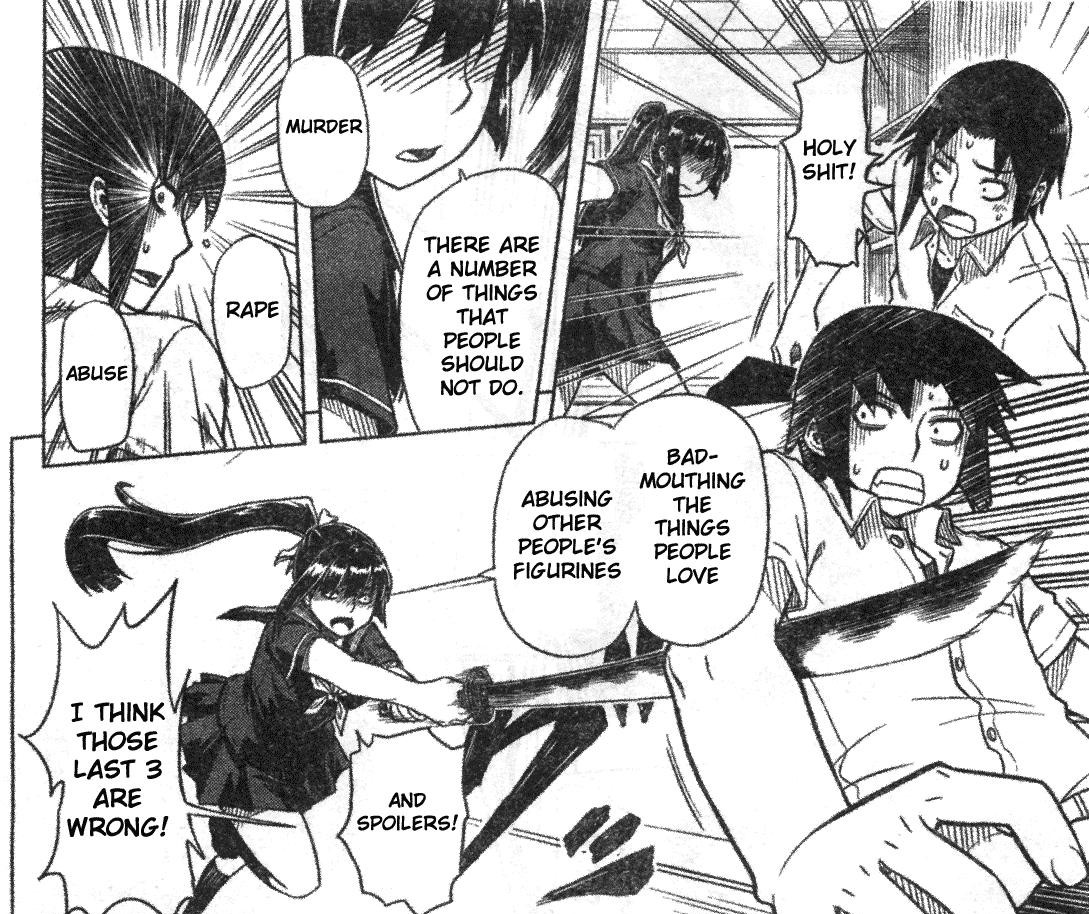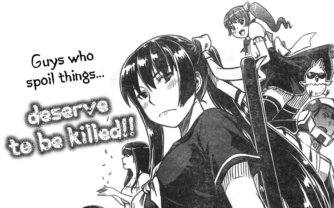 Basically, Mr. Cliche High School student is in anime club with his cute senpai, who can’t watch anime at home because of her upbringing or whatever. Our hero accidentally lets a spoiler slip for the currently-airing, super-popular magical girl anime, and the heroine freaks out, leading to a continually escalating war of the two throwing spoilers at each other in the most awkward ways possible. At least, that’s that it should be, if there were actually time to do it in. Spoiler Wars is really short, barely the length of a plain weekly manga chapter. It isn’t even that funny; the heroine is some sort of psychotic otaku, and I guess we’re supposed to laugh at that? I dunno.
