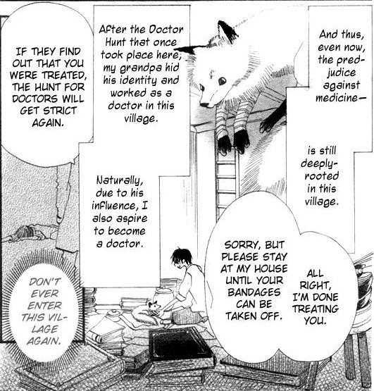 This oneshot follows Ena, a young man who – after traveling the world for several years – has returned to his quiet hometown to work as a gardener for the local lord. Not that he was traveling by choice, though. When Ena was a chlid, he and his friend Asagi learned the art medicine from Ena’s grandfather, wanting to save lives. The twist being, their hometown considers medicine to be black magic, practiced by evil sorcerers. Seven years ago, the two of them tried to smuggle in rare medicine to cure Asagi’s younger sister, but were discovered and Ena was banished. Just by showing his face again, he’s risking execution, but he feels it is his responsibility to save his hometown from itself. Unfortunately, since this is a oneshot, that’s about as far as I can elaborate without flat-out spoiling what happens, but by the same token it is a oneshot so you can probably predict exactly how it goes.