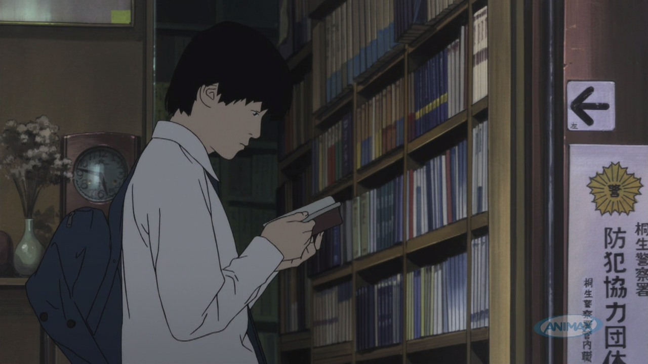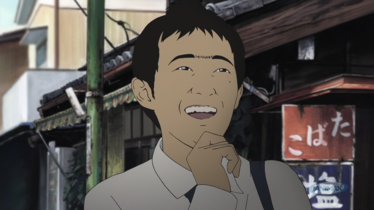 On the other hand, there’s no way to get away from the fact that it looks like crap. Rotoscoping was a brave and interesting stylistic choice, and one that partially pays off with the fluidity and naturalness of the motions – look at the way the boys fidget and twitch. But as is very common with rotoscoped productions, the quality of the art cannot keep up with the movement, and the result varies between naff and creepy. The uncanny valley is particularly bad in held still shots, where the lack of detail is jarring – look at Saeki smiling for an example. I think a limited, traditional style would have offered more artistic nuance, and also given them more control. I’m interested enough to be onboard for an episode two however.