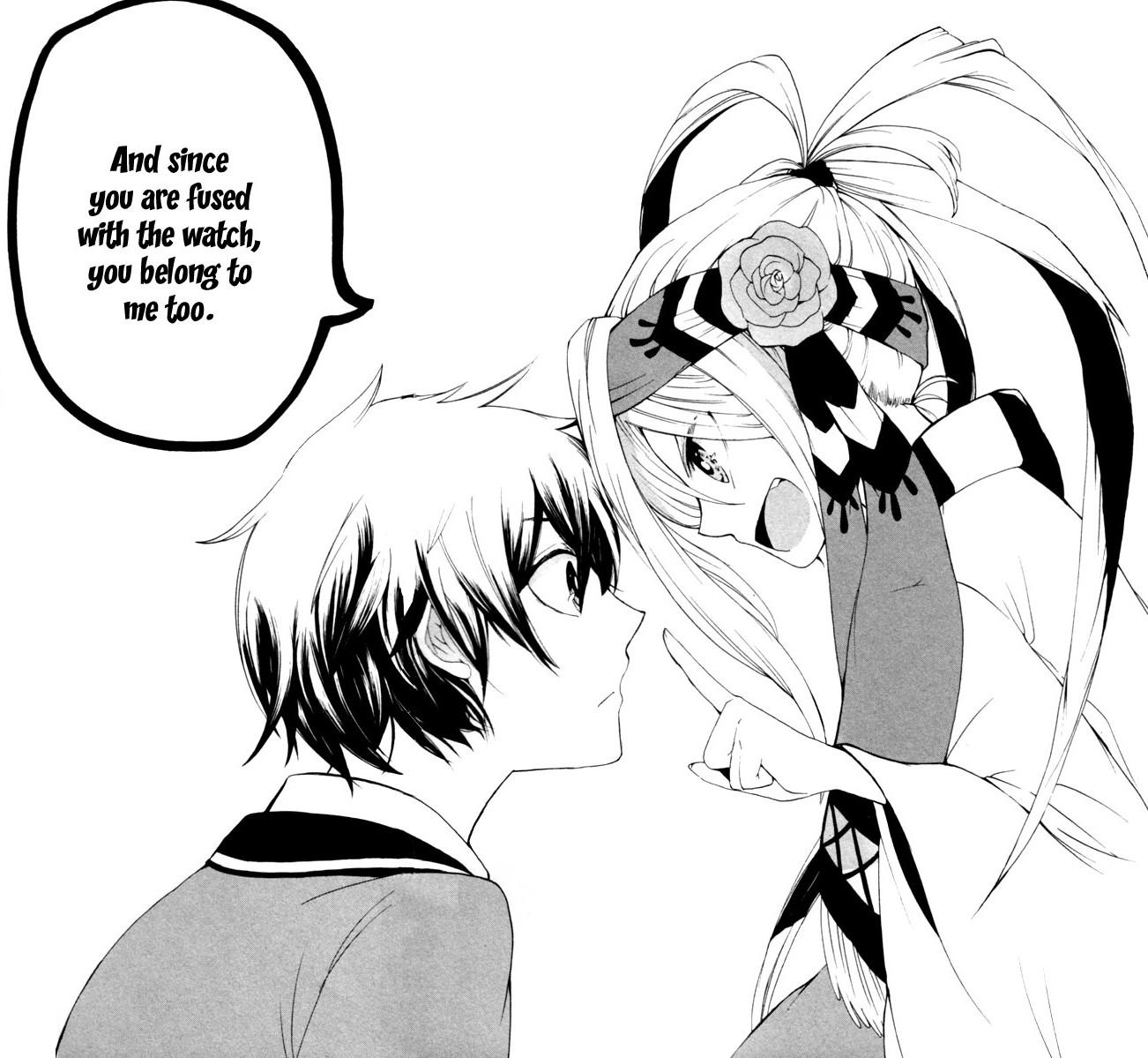 So yeah, our hero Akitsune accidentally switches bags with a strange little girl named List, and finds himself with a magic wristwatch (labelled Aschenputtel – perhaps better known as Cinderella) that can turn back an object’s personal time by 24 hours. He is summarily ambushed by a strange man with a magic item of his own: a piece of chalk (which he calls Wolf and the Seven Young Kids) that can cut things apart, and although List comes to the rescue in the nick of time, Akitsune is forced to turn the watch’s powers on himself to heal his wounds. He recovers, but since he wasn’t in possession of the watch 24 hours ago and Cinderella is a bit of a clingy lady, it fuses into his skin.