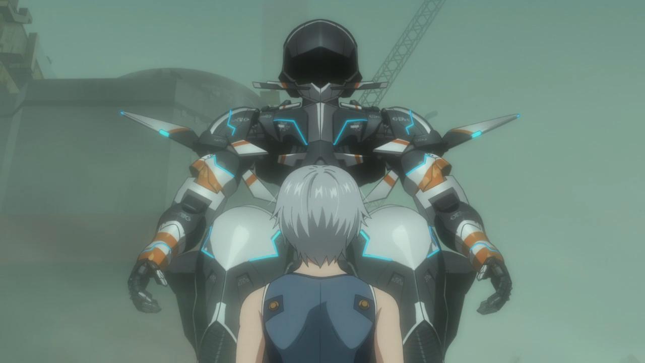 The other plot thread is Ledo’s coming to terms with the identity of his enemy, which doesn’t really go anywhere. He mopes a bit (some of the reaction shots are incredibly melodramatic and border on goofy), we get some stock footage, and then surprisingly it’s Chamber who gets the episode’s big speech. In contrast to my expectations however this actually works pretty well – Chamber’s cold, mechanical tone and the unswerving logic of his arguments make a pretty decent case for the continuation of the war and it’s a well written and delivered chunk of dialogue, as talky as it may be. The cuts back to Gargantia are highly effective as well. brief though they are, the glimpses we get of Ridget, Bebel and Amy remind us of the other story which has driven the series, namely Ledo’s interaction with the people of this world and how he’s essentially abandoned that.