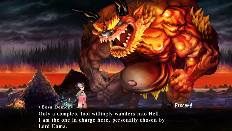 Muramasa‘s original release on the Wii was plagued by an inconsistent, terse, and painfully boring localization. Thankfully, Aksys has gone the extra mile to properly retranslate all of the dialogue for Rebirth, instead of just giving us a straight port. Everyone speaks in archaic Japanese that would fit in perfectly in a period piece or samurai flick, and this is translated excellently, with flowery language carrying the meaning across without being too obtrusive.