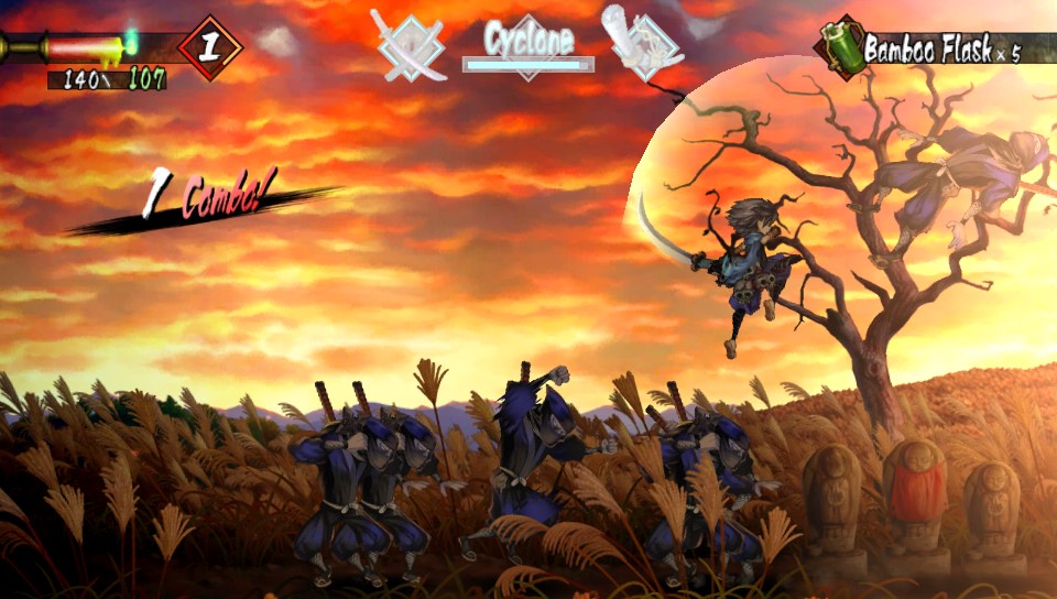 Spirit comes from eating. Yes, eating, both at restaurants scattered along the path and at your own campfire. Food provides a variety of effects in Muramasa, ranging from attack boosts to instant revival. But you can’t cook the best dishes in the middle of a fight, keeping you on your toes. Eating also makes you full, preventing you from stuffing your face in the middle of a boss battle just to heal your HP. Simple management of resources is necessary to prevent a miserable death, though the penalty for such is barely more than being shunted back a screen.