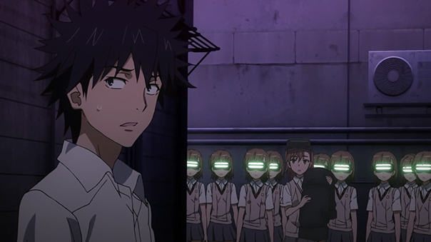 Zigg’s Thoughts: Mostly just going to back up Jel here. This is a competently written and decently executed episode that doesn’t really have a reason to exist. The one major plot machination that gets sorted out here is that Touma discovers the existence of the project. It’s a nicely handled scene that again plays well with the hive mind mentality of the MISAKAs but it doesn’t really add a lot. Otherwise this is mostly padding, including the seriously dumb Accelerator bits. There’s also Mikoto’s anguished attack on the facility, which actually manages to be surprisingly effective in communicating her cold fury but then goes on a little bit too long and borders on being drama for the sake of drama.