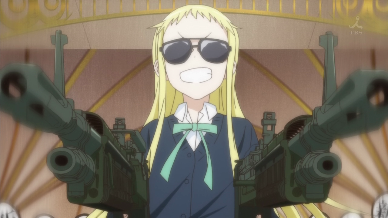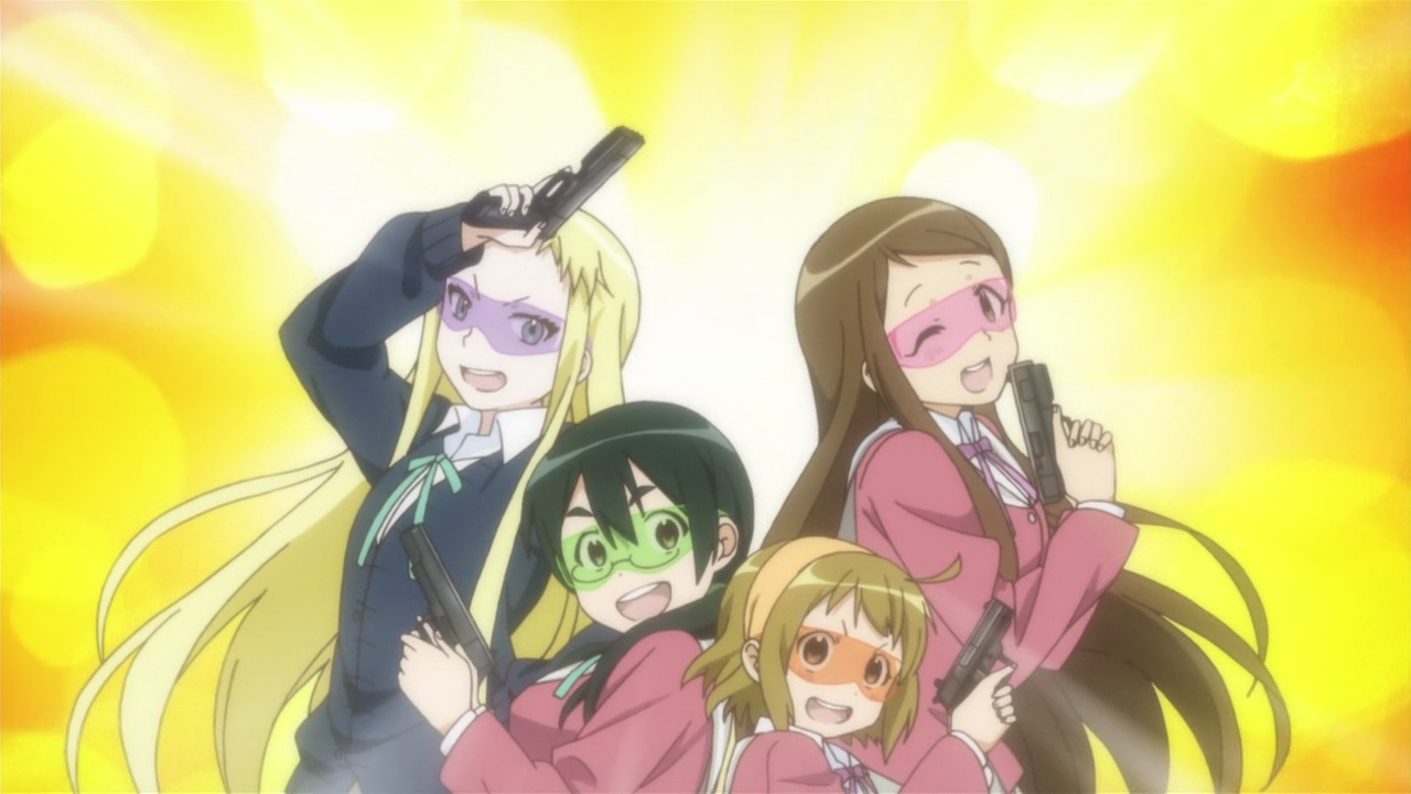 Otaku like cute schoolgirls. Otaku like nerding about about guns. I’ve just recreated the entire brainstorming session that came up with this show. It’s like somebody dug into a big box with ‘anime cliches’ on the side and dug out a bunch of bits they fitted together like Lego. Anxiety issues girl! Giant fancy school! Club full of quirky members which is on a recruitment drive! Silly name mispronunciation! There’s not an original bone in the body of this thing and watching it is incredibly wearisome as result. The thing which makes it tolerable is superior production value, as it looks nice, has a decent soundtrack and some good voice work. Otherwise, this is pure fodder for merchandise selling and questionable doujinshi.