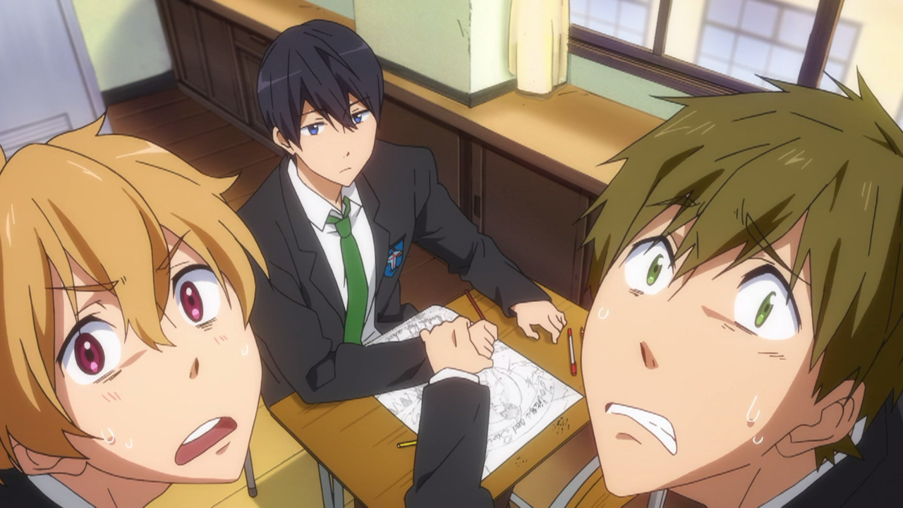 Speaking of female gaze, I love how Gou is essentially the token swooning pervert in this anime. Sure, she is a blatant audience proxy, but along with Miss Ama, she is a great personality who neatly balances out the cast. In her character lurks the fact that the writers made no effort in hiding what this show is all about, but it is done in such a happy-go-lucky way I have a hard time finding anything wrong with it. Free! is wish fulfillment of the same sort as the one Pathetic Otaku Oriented Titillation™ (henceforth to be referred to as POOT™) anime thrive on, but the only people it will offend are frightened misogynists and homophobes. Once again, Free! is much more welcoming towards a periphery demographic than most male-oriented anime. Gou’s covert lecherousness is far from the only trait the young manager has going on, and the same can be said for the swimbros and their tendency to walk around with their tops off and gaze longingly at each other. Free!‘s fanservice never gets in the way of characterization, and while I would rather see the wish fulfillment trope being destroyed and dragged through the mud altogether (hello, Flowers of Evil), inverting and downplaying it is at least a step in the right direction.