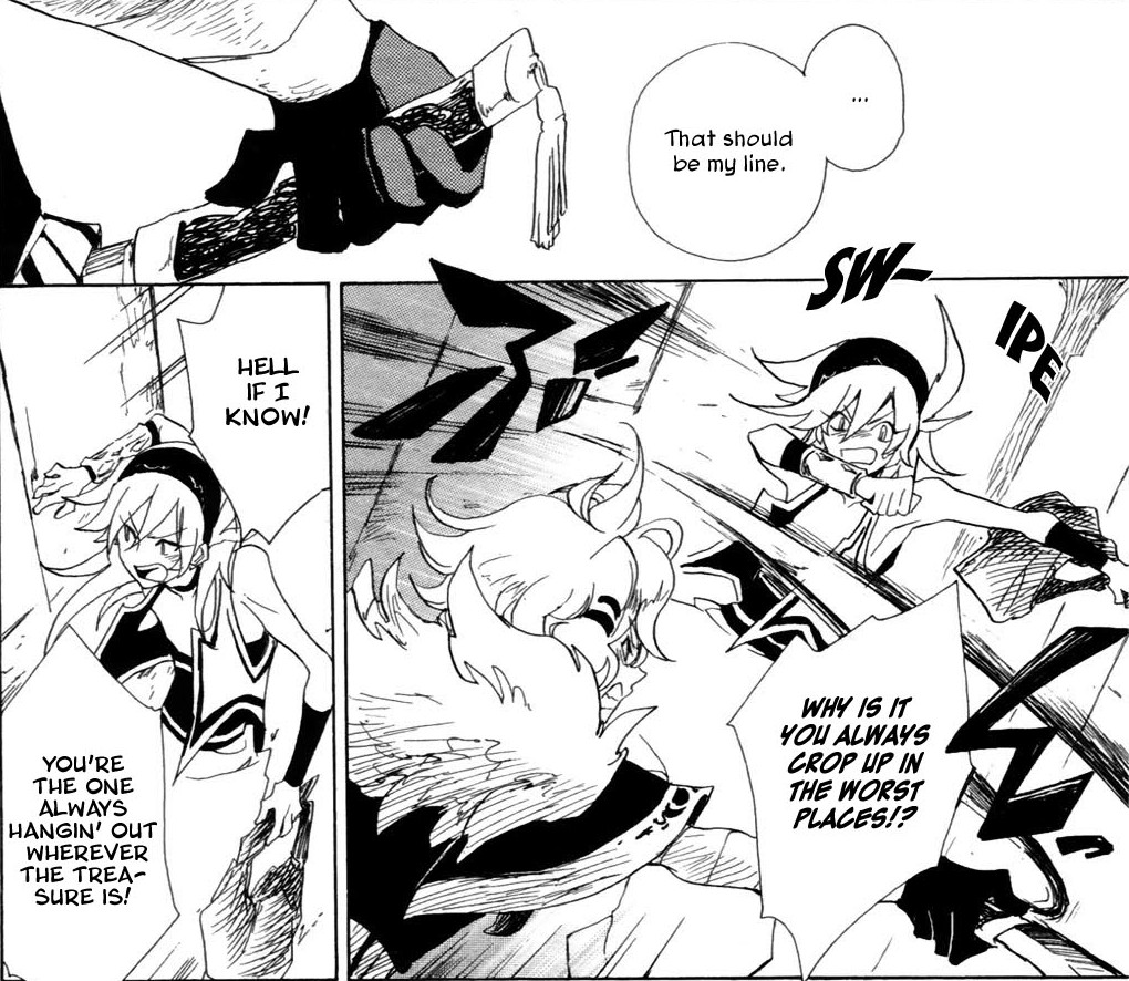 But since all anime/manga have to start with the main character(s) meeting a cute girl(s), stuff really starts to pick up once Ghee meets a sexy (and obviously evil) fortune teller who recommends Ghee head into some cave and grab the treasure. Ulupica is hot on his tail, and after a freak cave-in, they meet a pair of girls who seem to mysteriously shift in age from loli to teen, depending on their mood. Turns out they’re dragons or something, and really old besides. Long story short, all four of them end up questing for mystical stones that are related to Ghee’s family heirloom, which may or may not have been stolen from Ulupica’s ancestors 200 years ago…