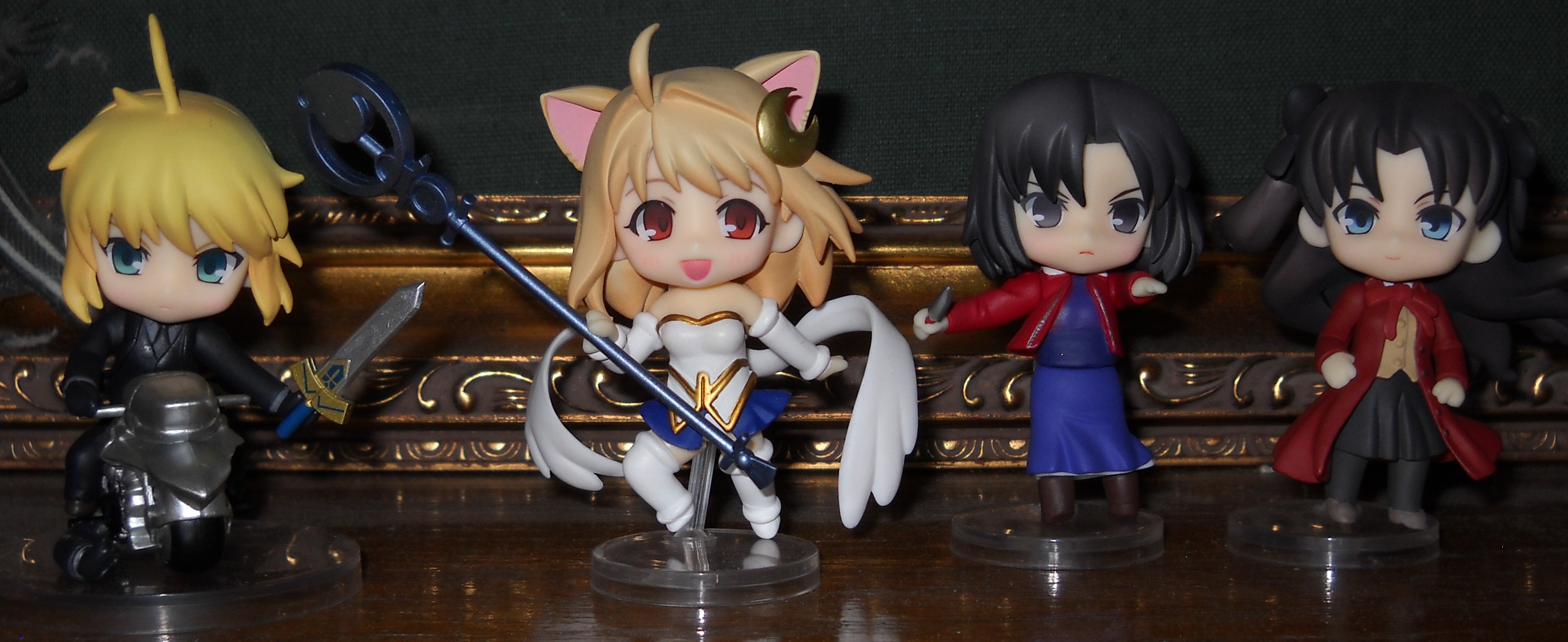 I picked these up at Anime Expo 2013, after standing in line for entirely too long at the GSC booth to buy Gee his stupid Little Witch Academia wall scroll. Actually, I only bought two, and since they’re random blind boxes I ended up with Phantasmoon and Rin. I rightfully thought of this as total bullshit, so I stood in line again (this time because my friends wanted to check out the booth) and bought two more, nabbing Saber on a motorcycle and Shiki Ryougi. Score! Putting them together was a pain, though. If a speck of dust drifts near these things, they pretty much explode into pieces.