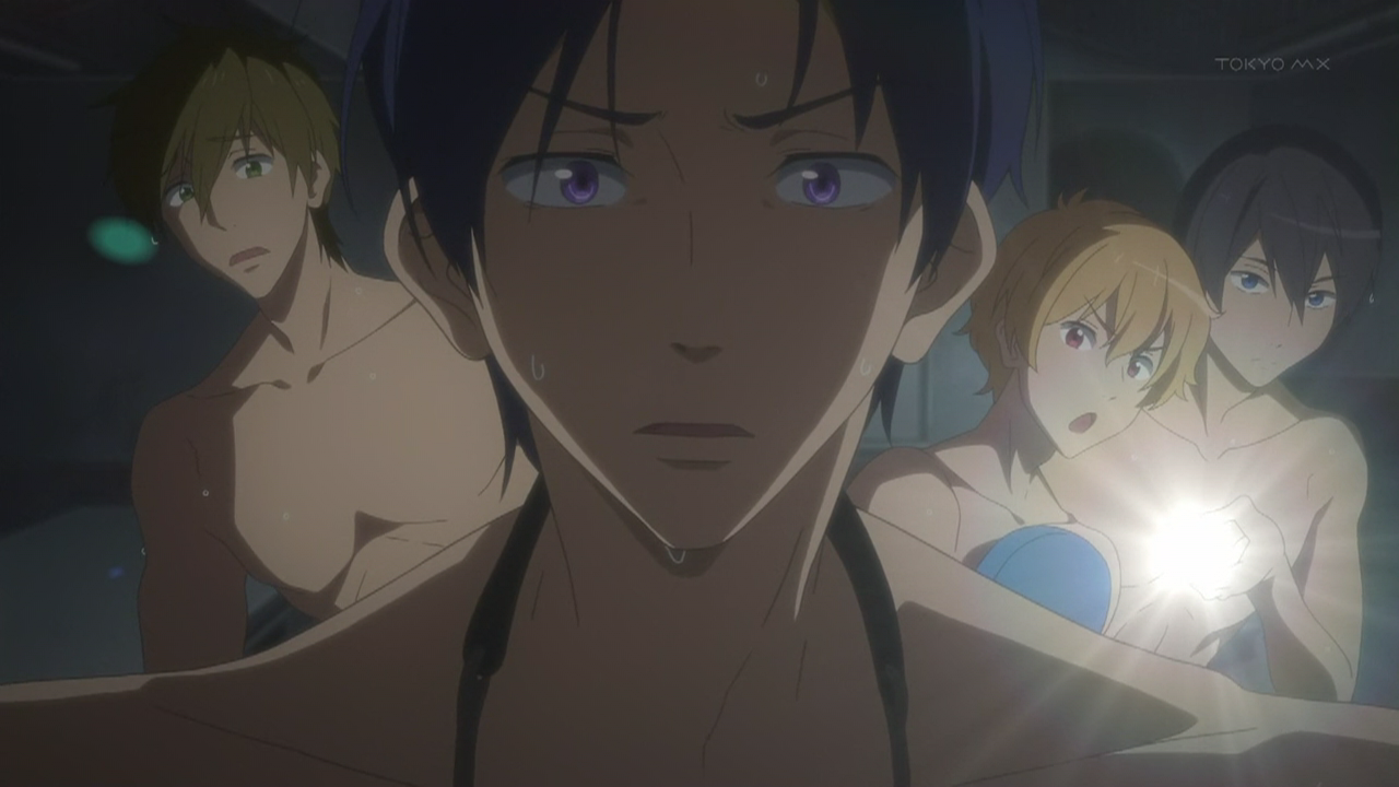 After last week’s surprising cliffhanger, I started to fear Free! would go down the same career path as Love, Chunibyou and Other Delusions and hit us in the face with thinly veiled attempts to manipulate our emotions. Luckily enough, this episode managed to succesfully merge drama, character development and breezy antics, making it seem more like the same friends going through a bit of a darker period rather than an uncharacteristic drama bomb. Makoto’s trauma is much more realistically portrayed and dealt with than Rikka’s bizarre Freudian motive which seemed to contradict the show’s earlier message. It gives his character a bit more depths without swallowing the entire show.