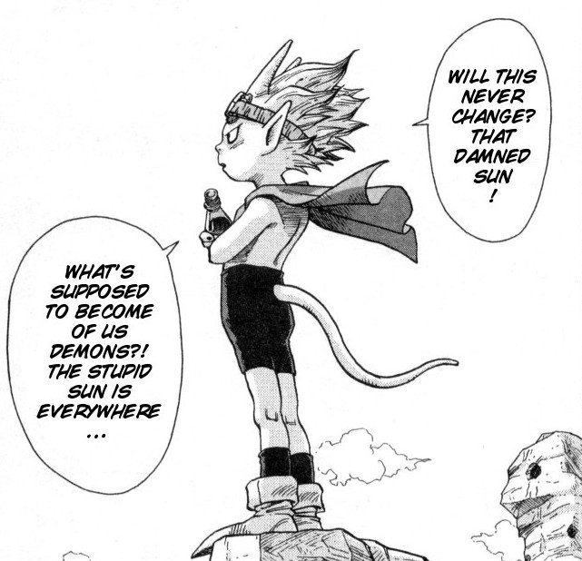 The eponymous Sand Land is a country covered by a seemingly endless desert. There’s been a drought for nearly 50 years, and all of the rivers and springs dried up after the war. The King is the only one who still has access to a source of fresh water, but he keeps its location top secret (to the point of banning all forms of aircraft) and sells it back to the populace at exorbitant prices. The people are rightly upset with this, but what is there to do? Tank brigades patrol the desert, protecting water convoys and crushing resistance.