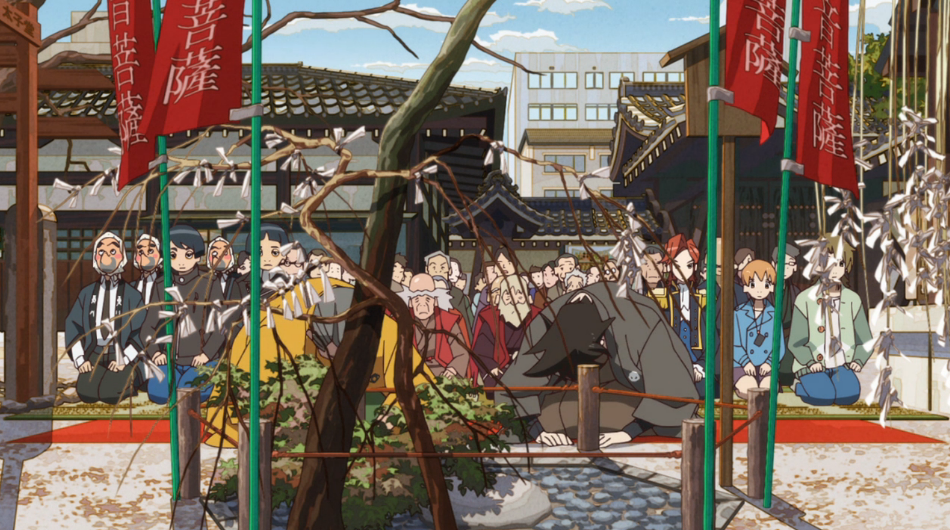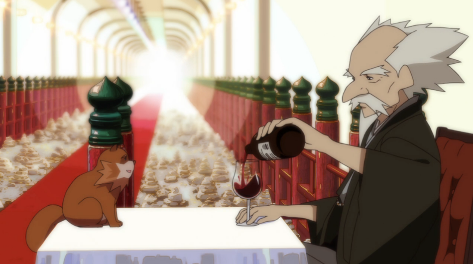 It’s nice to see some evidence that this tanuki society actually exists. Other than those bar-goers in episode 1 we havn’t seem much of anyone outside the Ebisugawas and Shimogamos. As is everything in tanuki society, what would appear to be the equivalent of Tanuki primaries is an incredibly traditional ceremony, with a strange tanuki known as the “Center Stone” at the middle of it. Hearing Yasaburo talk to Kaisei about it almost made it seem close to them, like perhaps their grandfather. Considering Yasaburo was able to mess with such an apparently high ranking tanuki and get away with only a scolding might lend some credence to that train of thought.