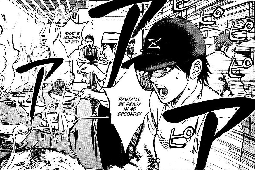 While it is a cooking manga, Bambino! focuses more on the actual business of running a restaurant than strictly on the preparation of food. Ban starts off as a kitchen assistant – washing dishes and preparing ingredients – and works his way up from there, giving the reader a glimpse at several facets of the restaurant industry. He has to adjust to all the Italian food terms being thrown around, learn to be a proper waiter who can provide top-notch service, deal with the massive crowds of the Saturday dinner rush, and learn to cook the signature dishes. Do any other cooking manga depict the job behind the chef?