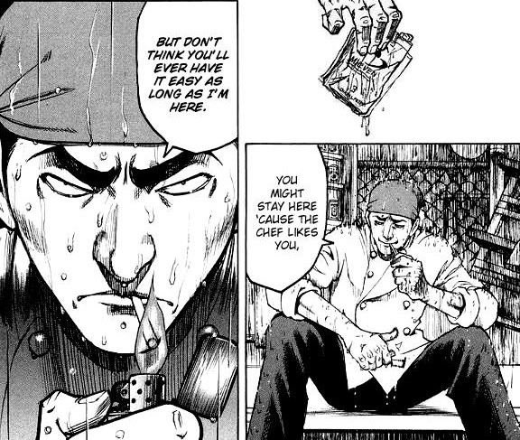 The realism factor was what drew me to Bambino! in the first place . Realistic culinary training (as opposed to weird cooking battles) is almost unheard of in cooking anime, as is a lack of the slice-of-life elements we may have come to expect. Perhaps it’s because Ban is an actual adult instead of a mere teen entering high school? Who knows?