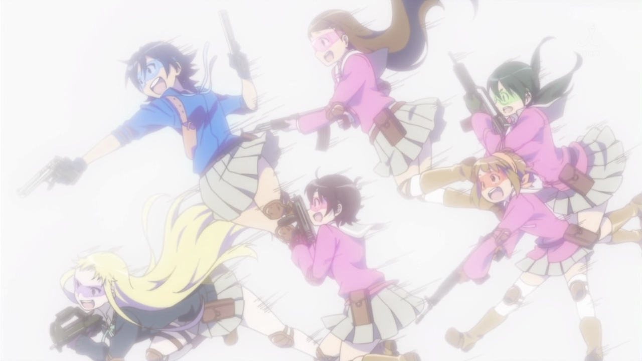 As the sun sets, Yura brings back her reality warping powers, but with some serious power boosts, allowing her the ability to literally rewrite all of reality within the radius of the entire campus, turning every student at the school into a willing and enthusiastic airsoft player. I shit you not, Yura literally pulls a Fate/Zero Rider and basically summons her own army of airsofters, Ionian Hetairoi style, for the club to fight against. Oh, and she also rewrites fucking time, allowing the C3 club to continue playing for as long as they can. It’s ridiculous and absurd, but wholly enjoyable all the same.
