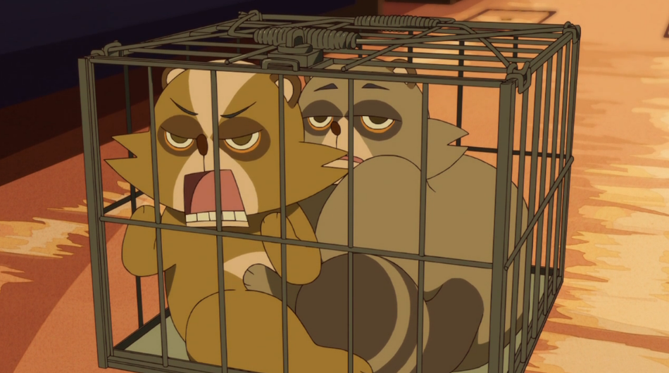 What I really loved was the total reversal of position between Yashiro and the twins. I still don’t get quite how it works that they were all sucked into Yajiro, and not just like Yajiro trying to ram into Ginkaku or something, but the resulting cage scene was just the best. After all the grief he had to go through, it was more than a bit satisfying to see Yasaburo toy with the pair before finally dropping them into the river. Each time the idiot brothers tried a scheme to mess with one of the Shimogamos, it was always their own hubris that eventually became their downfall.