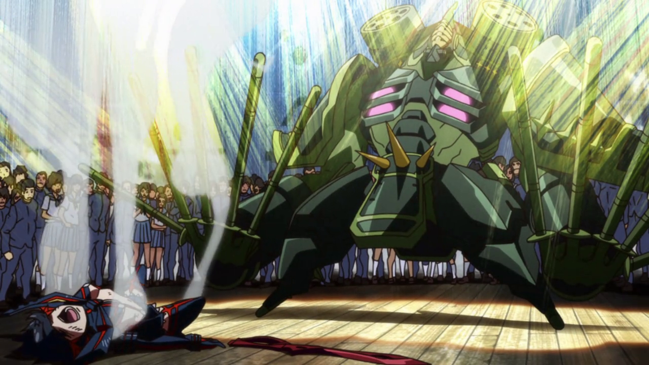 In the end, Ryuko suffers another painful defeat, really hammering home the point that she and Senketsu need to get stronger. I really appreciate this to be honest. I was initially worried that Ryuko would just keep winning and that the only obstacles she’d run into would be from club members using random devious tricks on her. With Tsumugu outwitting her and Sanageyama outclassing her in sheer power, it looks like Ryuko is the one who’s going to have to get better. Whether this means it’s time for a training montage, a convenient plot-induced powerup, or another oddly placed comedy episode, I don’t know. It’s obvious that Trigger will make Ryuko’s growth an important plot point in the future though.